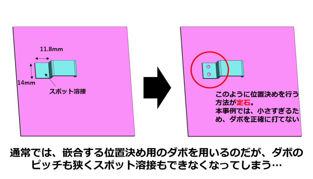 通常、部品の正確な位置出しには凸起(ダボ)を設けて嵌合させるのが定石です。板金部品にダボ、ブラケットに篏合する穴を2つあけることで固定した位置決めが真能です。しかし、本部品の溶接部分は14㎜×11.8㎜と非常に狭く、標準的なピッチでのダボ設置が困難でした。また、狭いため、嵌合するダボだと、スポット溶接ができませんでした。このため、本事例は当初はレーザ―でつけたケガキ線で位置決めを行っていました。