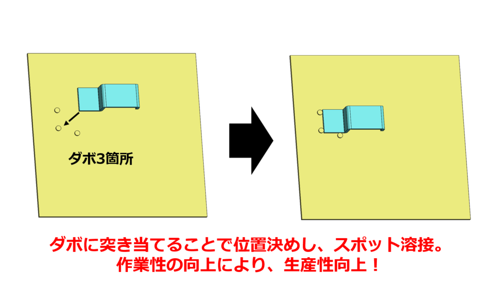 今回ご紹介するの事例は、位置決め凸起である「ダボ」を最適に配置することで、作業者が迷わず、かつ確実に部品を溶接できる仕組みを構築した事例です。当初は、レーザー加工工程で付けたケガキ線を位置決めとしておりました。しかし、3箇所のダボをによる位置決めに変更したことで、作業効率の向上と品質の安定化を同時に実現いたしました。