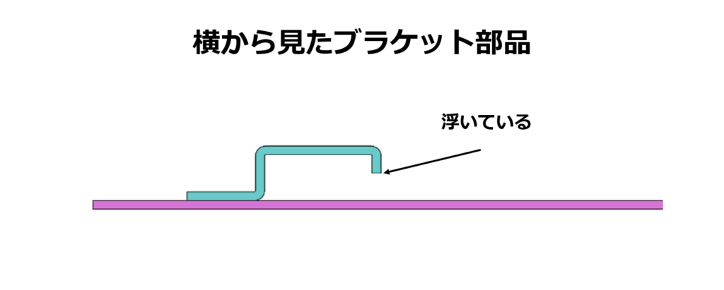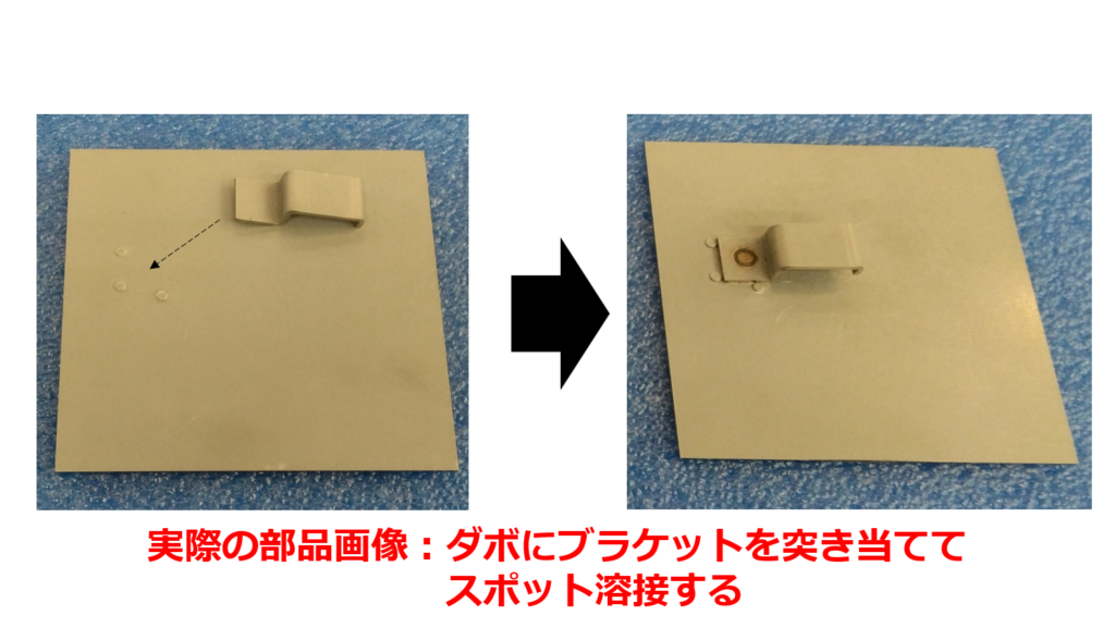 ブラケット部品の特性上、板金部品にセットした際に片側が浮き上がってしまう構造をしていました。このため、位置の固定ができないので、手で押さえながら溶接を行います。