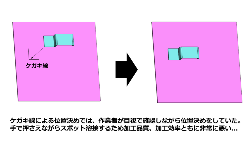 このため、ケガキ線に視覚的に位置を合わせても、スポット溶接時に部品の位置が数ミリずれてしまうことがあったり、作業者の疲労度により加工精度とスピードも変動するため、加工効率が非常に悪い作業となっておりました。