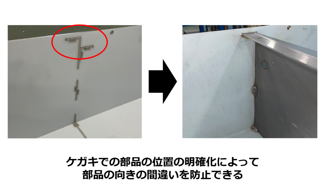 部品を設置する位置に、部品の形状・向きに合わせてケガキ線を付けます。これにより、作業者はこのケガキに合うように部品を溶接すればよいため、図面や寸法を毎回罫書きすることなく、正しい位置・向きで溶接することができます。