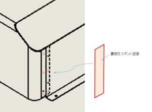 この対策として、仕様上、つなぎ目が見えても問題がない場合にはアーク溶接からスポット溶接に変更します。下記の図を参照頂きたいのですが、溶接が必要な部分の裏側に当て板を用意し、スポット溶接で接合することで作業が簡単になり、コストの削減につながります。