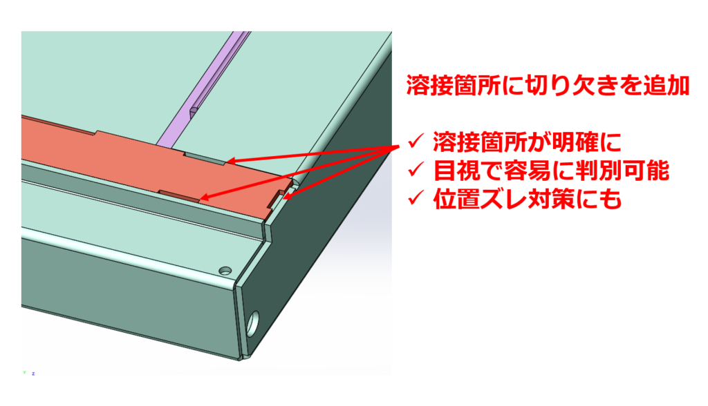 切り欠きを目印にして隅肉溶接をするように変更することで、溶接していない箇所も目視ですぐに判別することができるようになります。また切り欠きによって溶接位置も明確になるため、溶接位置がズレたり、誤った箇所に溶接してしまうといったトラブルの防止にもつなげることができます。