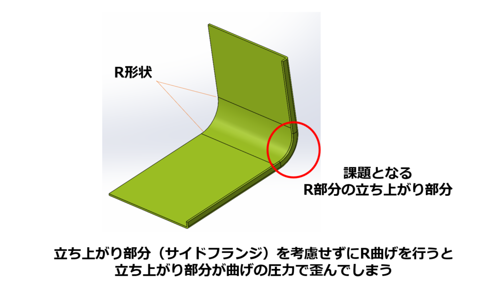 課題:立ち上がり付きのR曲げ加工で、そのまま曲げるとしわが発生してしまう…