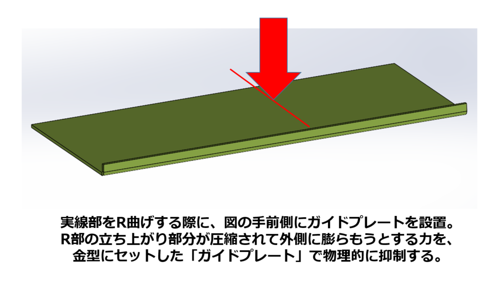 これは、R曲げを行う際、R部の立ち上がり部分が圧縮されて外側に膨らもうとする力を、金型にセットした「ガイドプレート」で物理的に抑え込むという手法です。